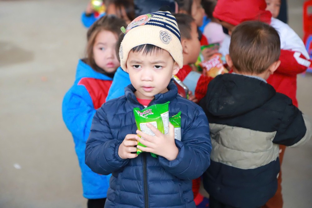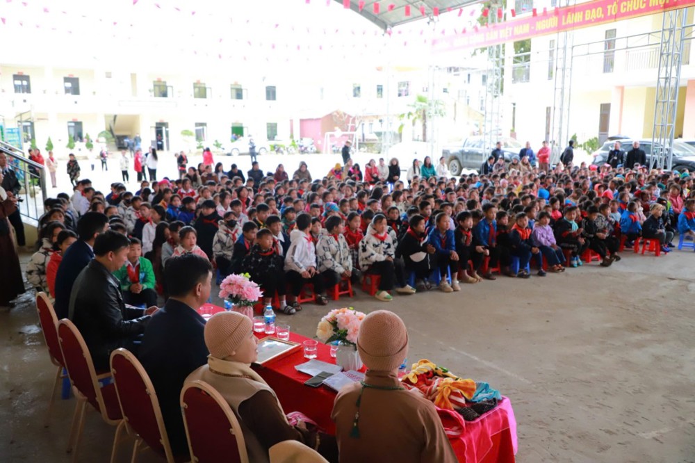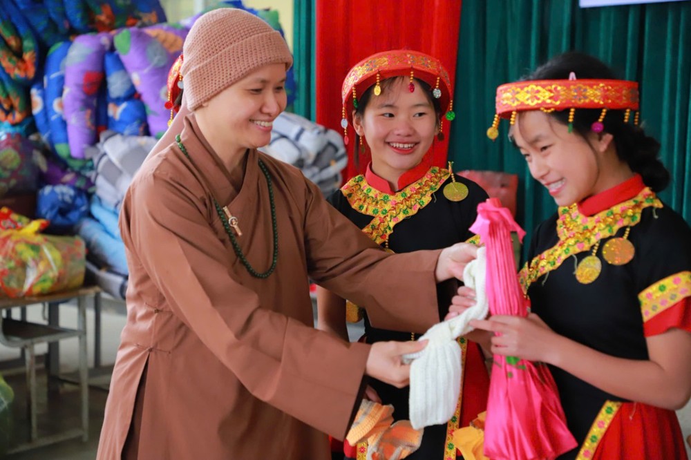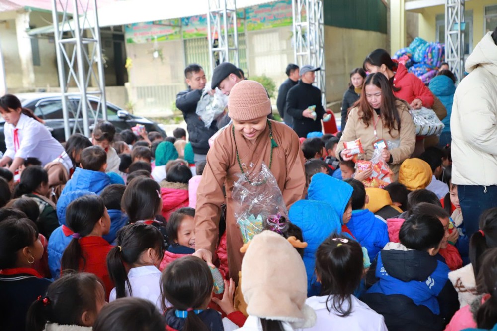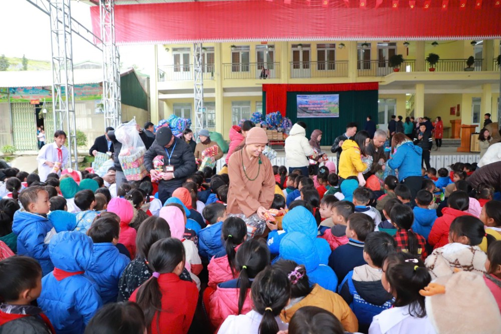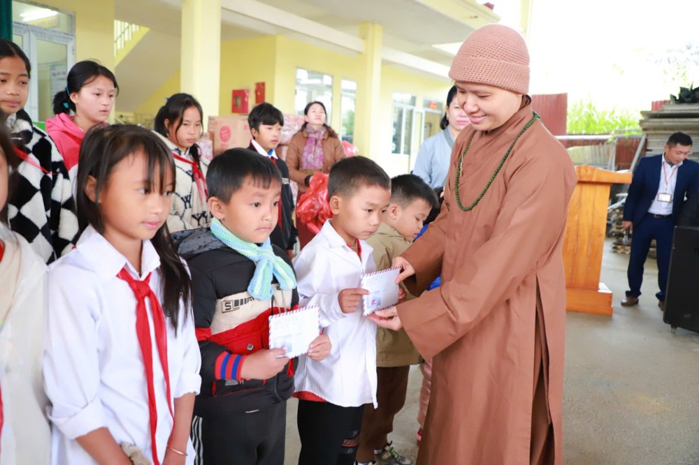Những phần quà gồm bánh, sữa, kẹo, chăn ấm, quần áo… được trao tận tay các em học sinh, gửi gắm tình thương và sự quan tâm của Tăng Ni, Phật tử tới các em nhỏ nơi vùng cao còn nhiều thiếu thốn.