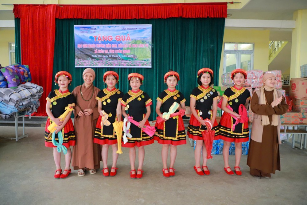Phát biểu tại buổi trao quà, Sư thầy Thích Diệu Quang chia sẻ: “Đoàn đã vượt hơn 400 km qua những cung đường đèo dốc để đến với Khâu Vai. Dù còn nhiều khó khăn, nhưng với tâm từ bi và tinh thần của người con Phật, chúng tôi mong muốn mang đến niềm vui nhỏ bé cho các em vùng cao. Chuyến đi vốn dự định tổ chức vào dịp Trung thu, song do ảnh hưởng mưa bão nên hôm nay đoàn mới có thể trực tiếp trao tận tay các phần quà đến các em.”