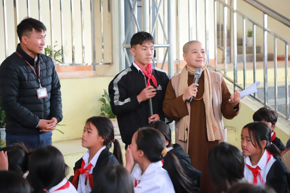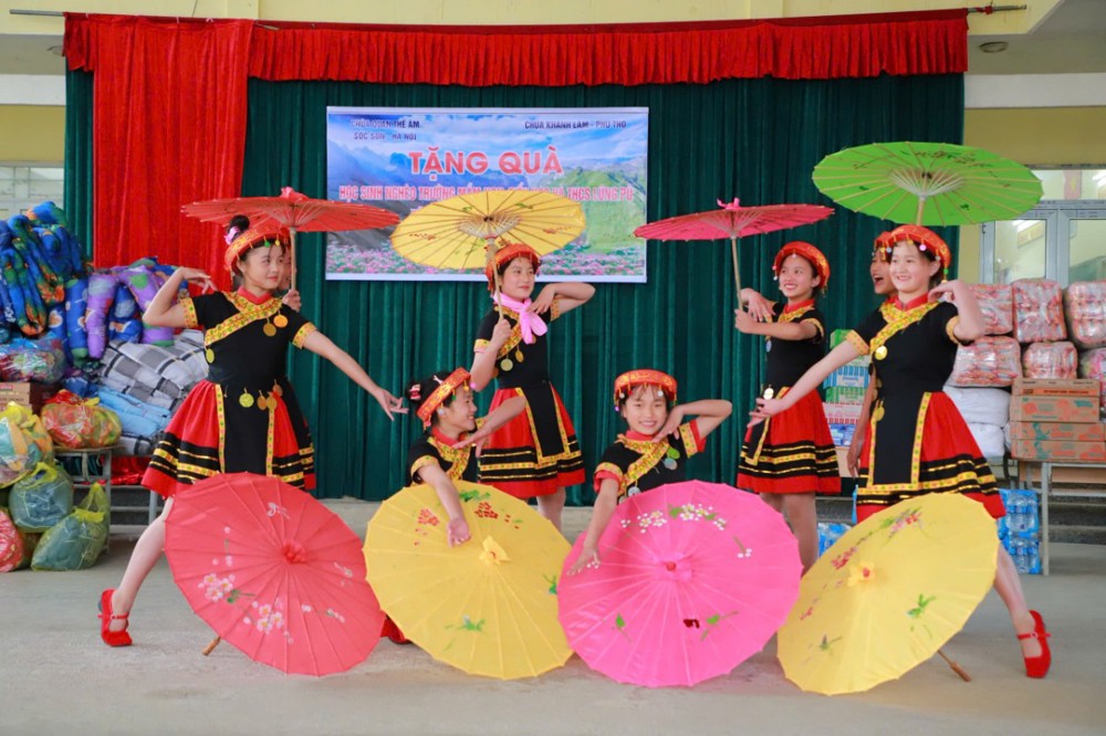 Chương trình mở đầu bằng các tiết mục văn nghệ chào mừng do học sinh biểu diễn, mang đến không khí tươi vui, ấm áp nơi vùng cao. Tiếp đó, các em được giao lưu cùng quý Sư thầy, tham gia trò chơi đố vui Phật pháp với nhiều câu hỏi bổ ích và nhận những phần quà khuyến khích học tập.