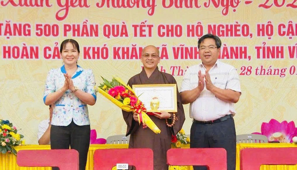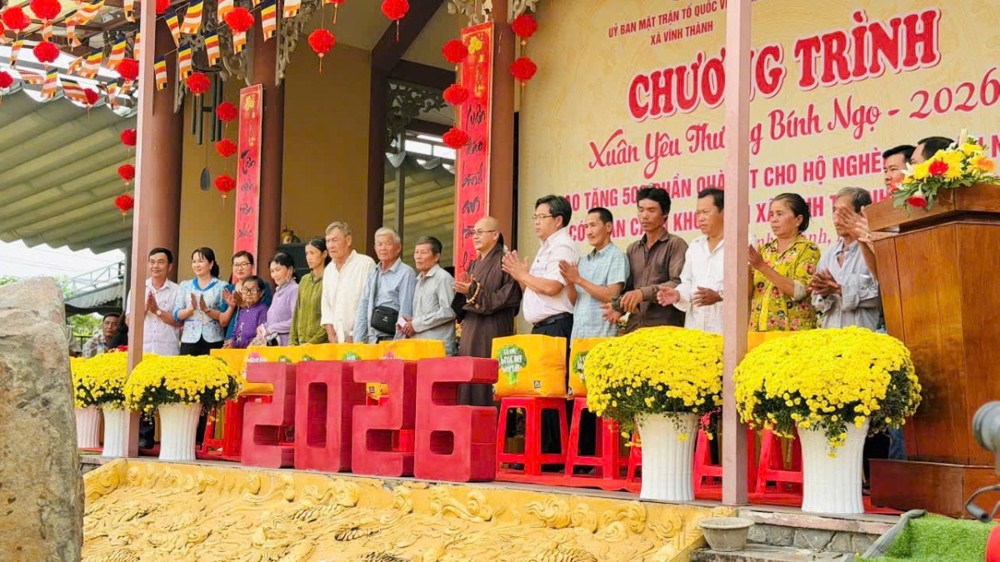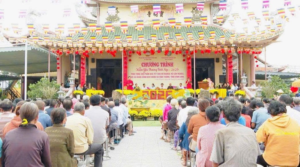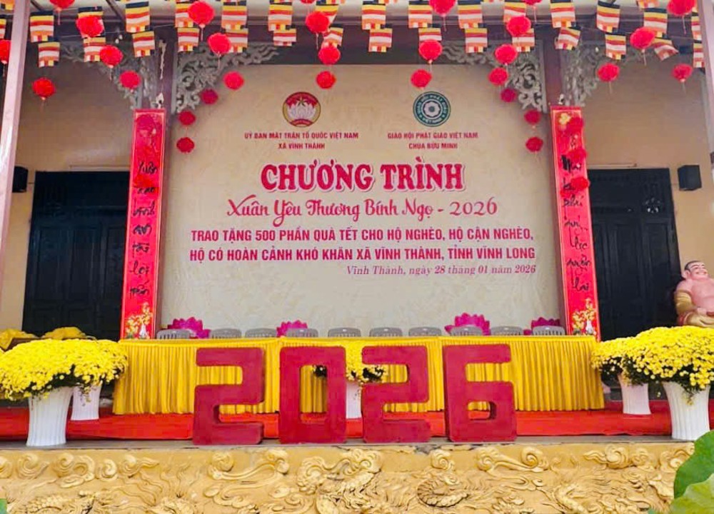 PSO – Trong không khí hân hoan đón chào mùa xuân mới, phát huy tinh thần từ bi cứu khổ của đạo Phật, đồng thời chung tay chăm lo đời sống cho bà con có hoàn cảnh khó khăn trên địa bàn, ngày 28/01/2026 (nhằm ngày 10/12/năm Ất Tỵ), tại Chùa Bửu Minh (xã Vĩnh Thành, tỉnh Vĩnh Long), ĐĐ. Thích Xuân Nguyện – Trụ trì chùa Bửu Minh đã phối hợp cùng Ủy ban Mặt trận Tổ quốc Việt Nam xã Vĩnh Thành đã tổ chức chương trình “Xuân yêu thương” năm 2026 đã trao tặng 600 phần quà Tết đến các hộ gia đình có hoàn cảnh khó khăn, nhằm chăm lo Tết cho bà con có hoàn cảnh khó khăn trên địa bàn.