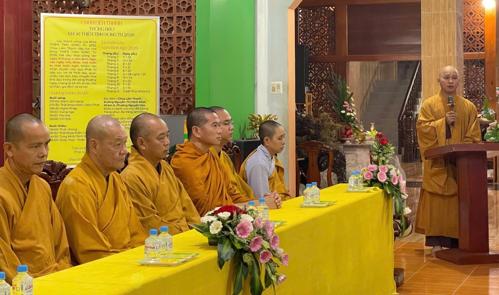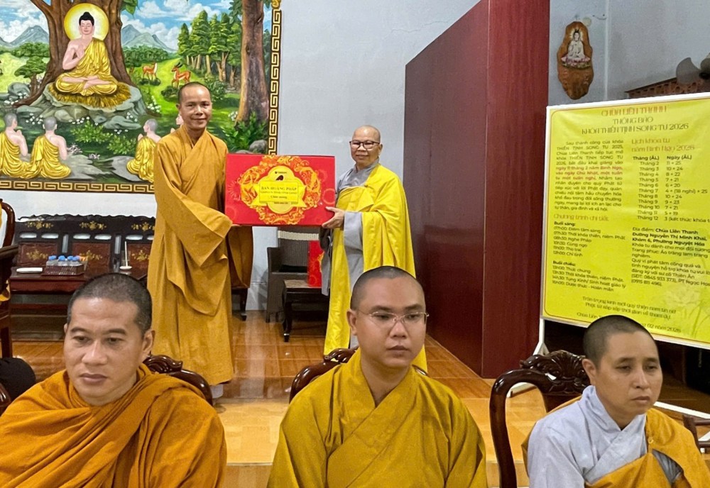 PSO – Ngày 29/03/2026 (nhằm ngày 11/02 năm Bính Ngọ), tại chùa Liên Thanh (phường Nguyệt Hóa, tỉnh Vĩnh Long), Ban Tổ chức đã trang nghiêm đón tiếp Thượng tọa Thích Minh Đạo – Phó Trưởng ban kiêm Trưởng Ban Hoằng pháp BTS GHPGVN tỉnh Vĩnh Long, cùng chư Tôn đức trong phái đoàn quang lâm thăm hỏi, sách tấn chư Tôn đức Tăng Ni thuộc Ban Hoằng pháp khu vực tỉnh Trà Vinh (cũ), đồng thời động viên Phật tử tại đạo tràng khóa tu “Thiền Tịnh”.