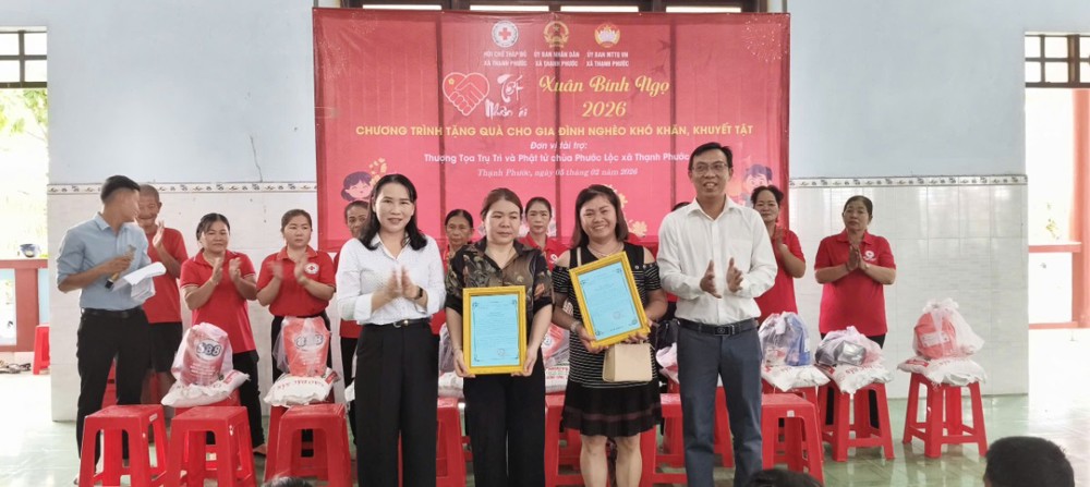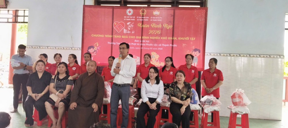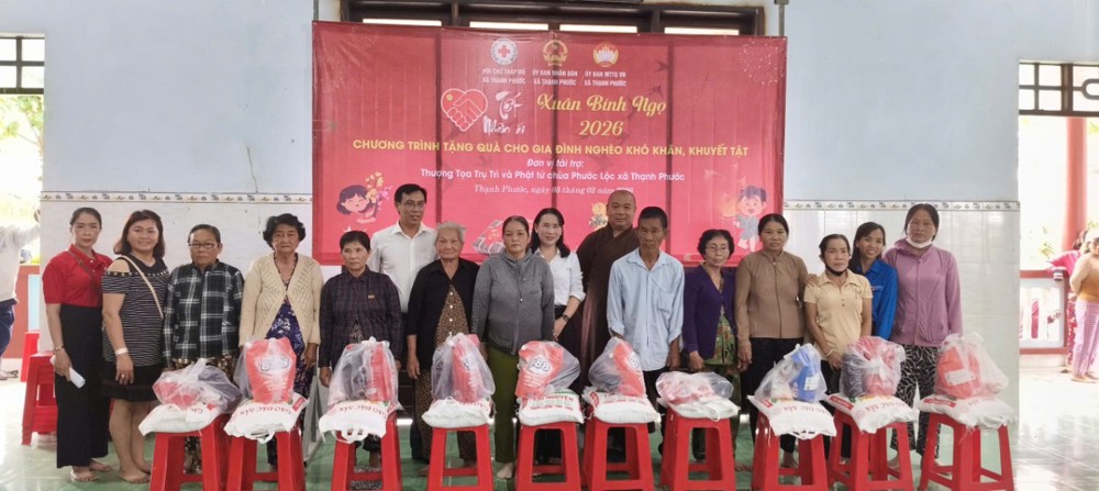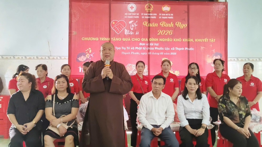 Trong hai ngày 04 và 05/02/2026, Thượng tọa Thích Trí Thọ – Ủy viên Hội đồng Trị sự, Phó Trưởng ban Thường trực Ban Trị sự Giáo hội Phật giáo Việt Nam tỉnh Vĩnh Long, Trụ trì chùa Phước Lộc, cùng chư Tăng chùa Đông Phước và các Phật tử mạnh thường quân, đã tổ chức trao tặng quà Tết đến bà con có hoàn cảnh khó khăn trên địa bàn hai xã Thạnh Phước và Bình Đại.