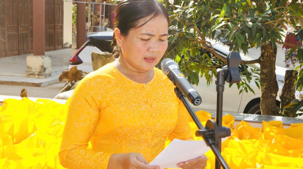 Đại diện chính quyền địa phương, Bà Nguyễn Thị Ri Đô đã phát biểu ghi nhận và trân trọng cảm ơn sự quan tâm, hỗ trợ đầy nghĩa tình của Ban Từ thiện – Xã hội GHPGVN tỉnh Vĩnh Long cùng chư Tôn đức tông phong Tổ đình Vĩnh Bửu và quý nhà hảo tâm. Ông cho biết, những phần quà tuy giá trị vật chất không quá lớn, nhưng mang ý nghĩa tinh thần sâu sắc, góp phần động viên bà con vơi bớt khó khăn, thêm niềm tin và nghị lực vươn lên trong cuộc sống, đón Tết cổ truyền trong không khí ấm áp, an vui.