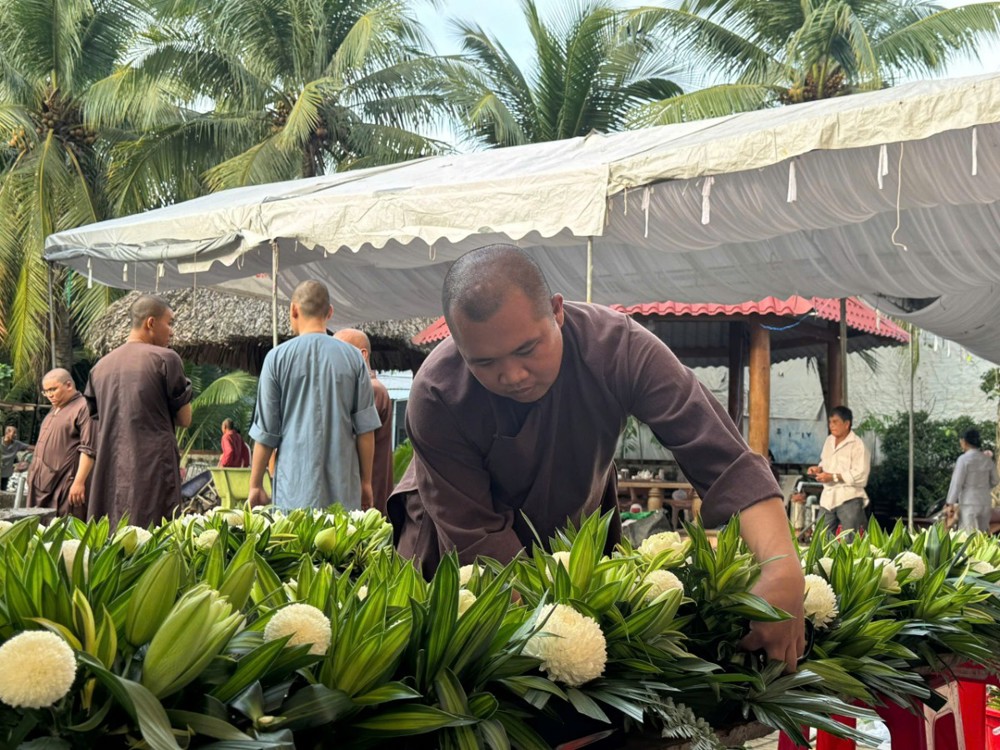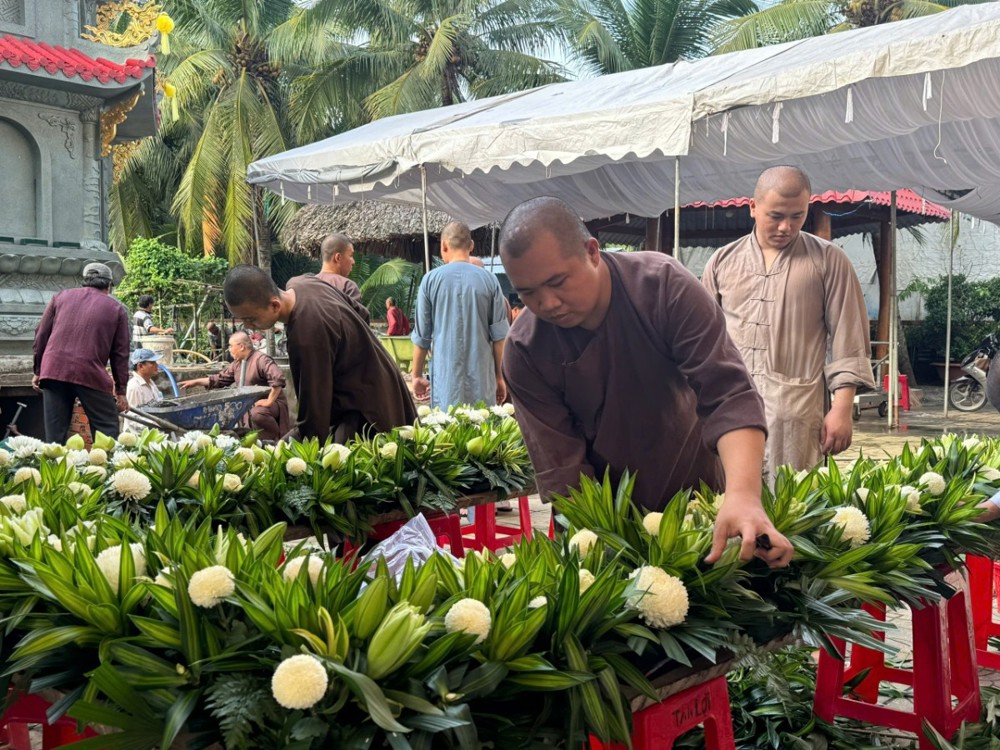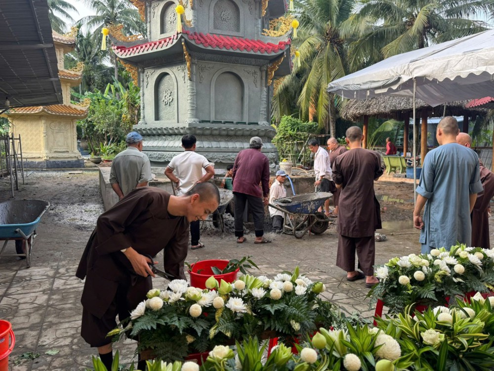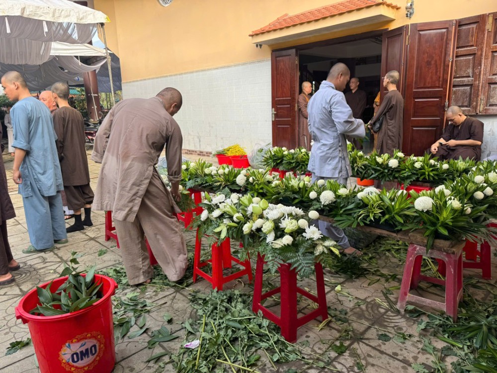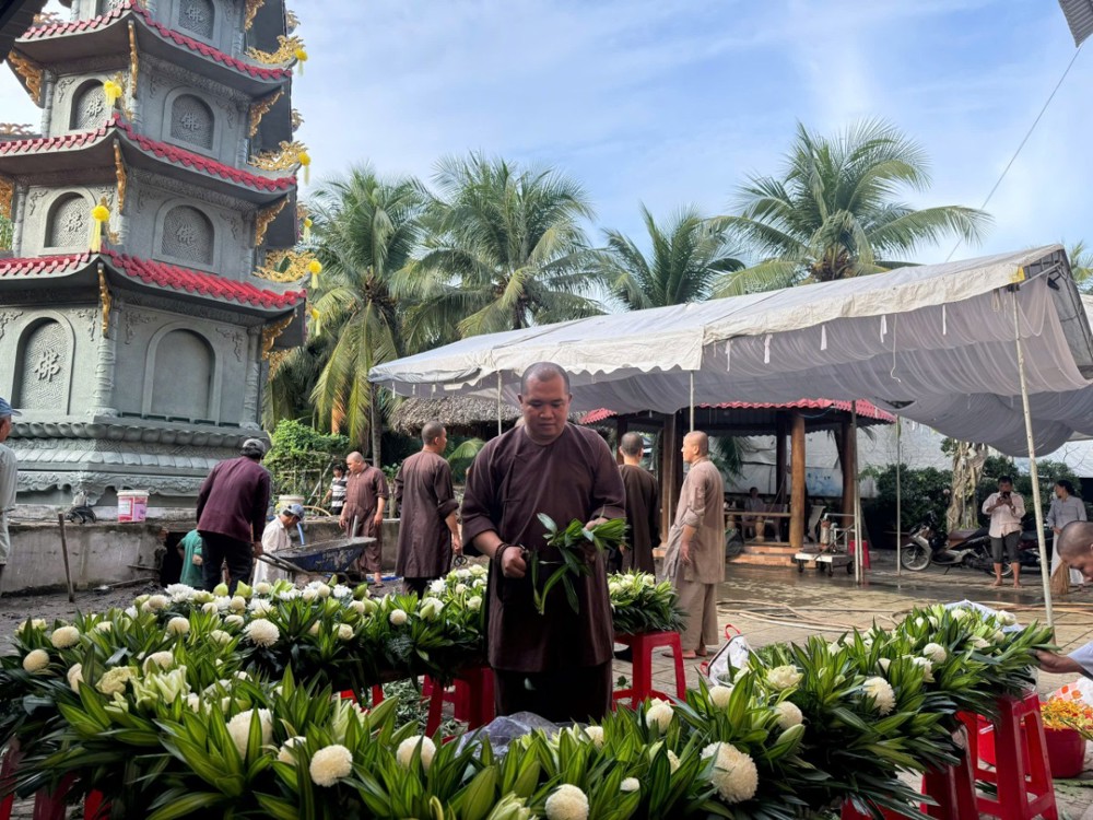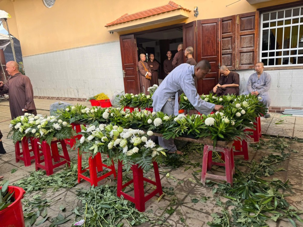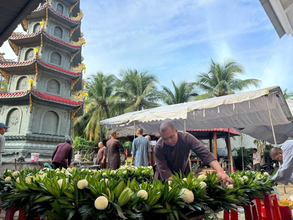 Từ tinh sương, chư Tôn đức Ban tổ chức, Tăng Ni và Phật tử địa phương đã dốc trọn tâm lực, tận tụy chuẩn bị từng chi tiết – từ việc thiết lập lễ đài, trang trí khuôn viên bảo tháp đến sắp đặt từng tuyến đường cung nghinh – tất cả đều được thực hiện với tấm lòng chí thành, mong sao buổi lễ được viên mãn, xứng đáng với ân đức của bậc Cao Tăng khả kính. Không gian chùa rợp sắc cờ Phật giáo, điểm xuyết những đóa hoa Lan tinh khiết biểu trưng cho tâm thanh tịnh và lòng tôn kính vô biên.