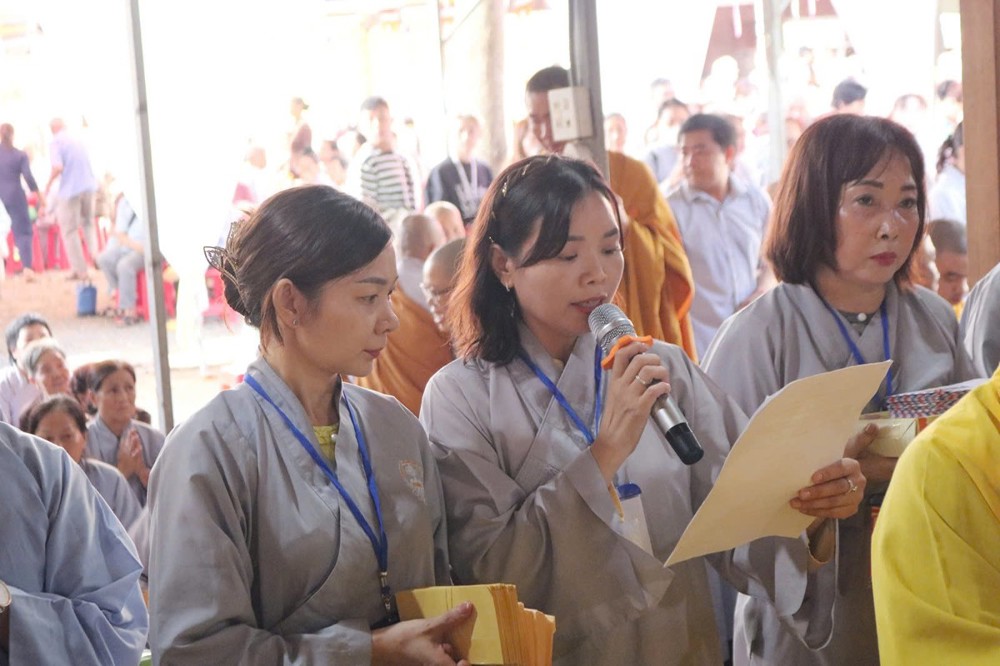 Kế đến, đại diện hàng Phật tử cung đối trước chư Tôn đức dâng lời tác bạch cúng dường trai Tăng, pháp y, tịnh tài tịnh vật lên chư Tôn đức hiện tiền Chứng minh nhân buổi lễ ngày hôm nay được vẹn tròn công đức và thập phần viên mãn.