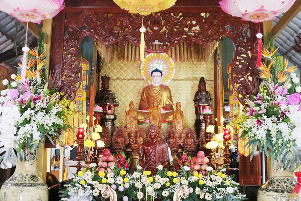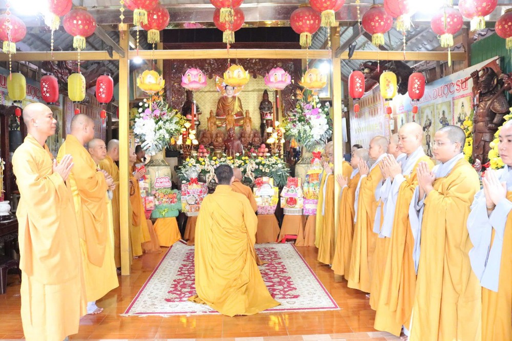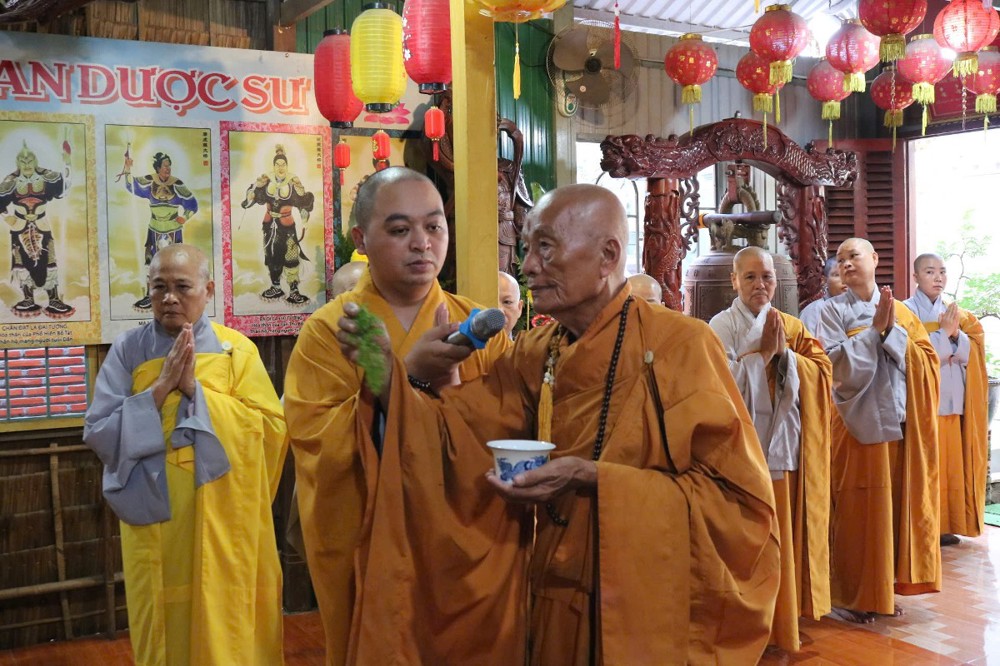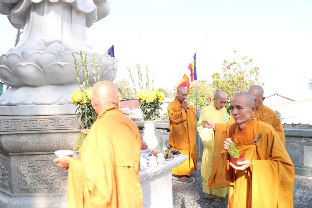 Tại Tổ đường chùa Long Hoa, Ban Tổ chức thành kính dâng lời tác bạch cung thỉnh chư Tôn đức Giáo phẩm quang lâm Chánh điện trang nghiêm cử hành nghi thức niêm hương bạch Phật, đảnh lễ Tam bảo, sái tịnh an vị Tôn tượng Phật Thích Ca Mâu Ni tại chánh điện, Tôn tượng Phật Dược Sư và Quan Âm Bồ tát trong khuôn viên chùa.