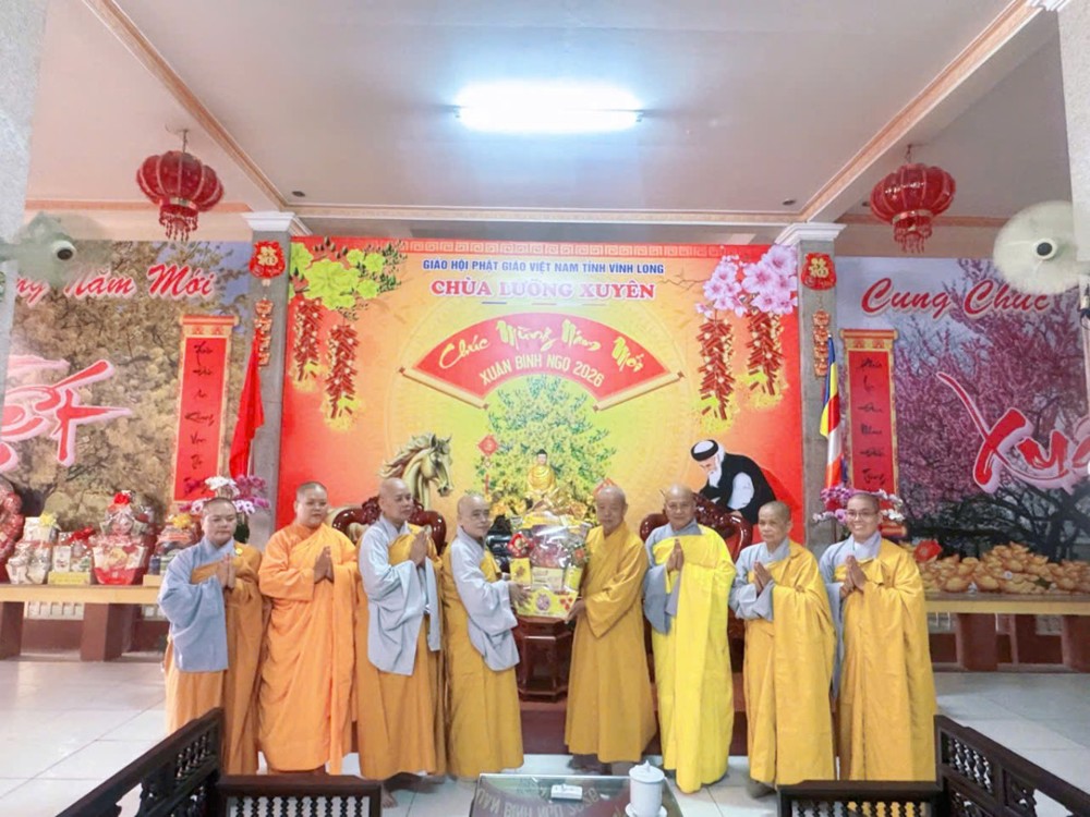 Cũng trong chiều cùng ngày, đoàn đã đến Văn phòng Thường trực 2 – chùa Lưỡng Xuyên (phường Trà Vinh) thăm và chúc Tết Hòa thượng Thích Trí Minh – Ủy viên Hội đồng Trị sự, Phó Trưởng ban Thường trực kiêm Phó Thường trực Ban Tăng sự GHPGVN tỉnh Vĩnh Long, Trụ trì chùa Lưỡng Xuyên, cùng chư Tôn đức giáo phẩm. Trong không khí ấm tình đạo vị đầu Xuân, đoàn đã kính dâng lời vấn an sức khỏe, chúc mừng năm mới an lạc, cầu chúc chư Tôn đức thân tâm thường lạc, Phật sự viên thành.