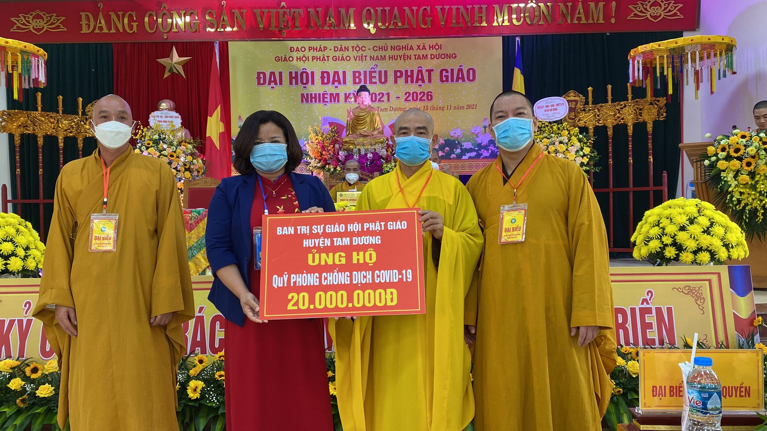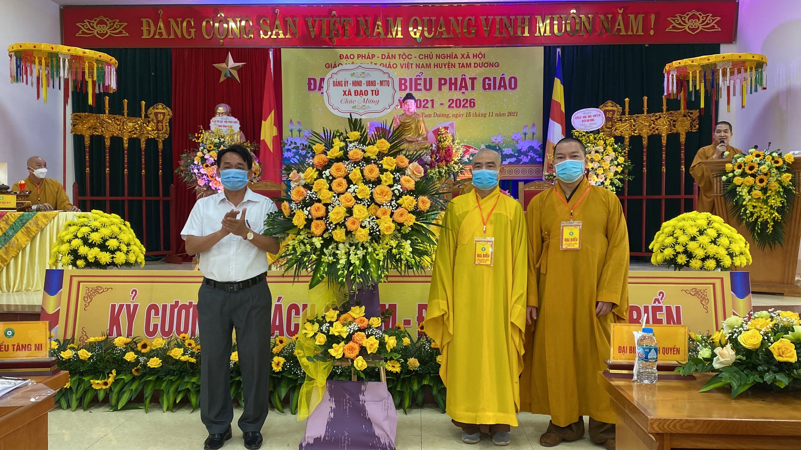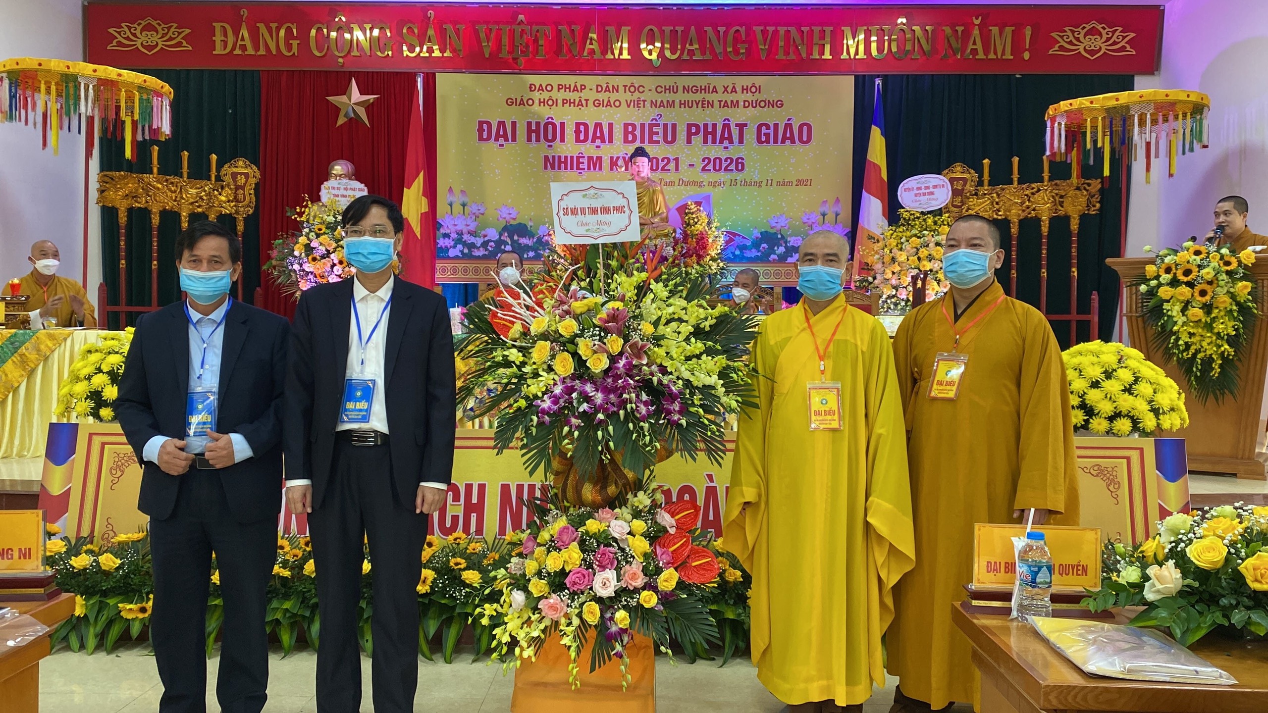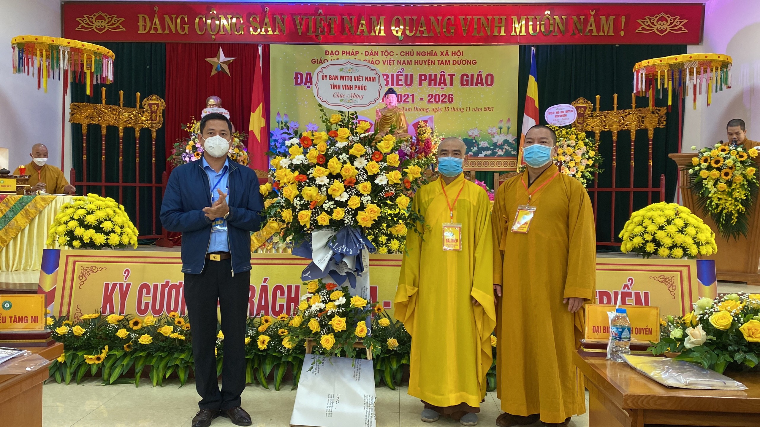 Quang lâm chứng minh Đại hội có sự hiện diện của ; TT.Thích Minh Trí- UV HĐTS TƯ GHPGVN, Phó BTS PG tỉnh Vĩnh Phúc; ĐĐ Thích Thanh Lâm- UV HĐTS TƯ GHPGVN, Phó BTT BTS GHPG tỉnh Vĩnh Phúc ; TT Thích Minh Pháp- Phó BTS PG tỉnh Vĩnh Phúc, Trưởng BTS PG huyện Yên Lạc; ĐĐ Thích Tâm Vượng – Phó ban kiêm Chánh thư ký, Trưởng ban TT&TT PG Tỉnh, Trưởng BTS PG TP Vĩnh Yên, Trưởng BTC Đại hội Phật Giáo huyện Tam Dương ; TT.Thích Thanh Phương- UV BTT BTSPG Tỉnh, Trưởng BTS huyện Tam Đảo; TT. Thích Tỉnh Thuần- UV BTTBTS Tỉnh, Trưởng BTS huyện Sông Lô; Sư cô Thích Nữ Viên Đăng- UV BTT, Phó Thư ký Chánh Văn phòng BTS PG tỉnh ; ĐĐ. Thích Nguyên Cao – UV BTT BTS GHPG tỉnh, Trưởng BTS PG huyện Vĩnh Tường; ĐĐ.Thích Vĩnh Trường – UV BTT BTS PG tỉnh, Trưởng BTS PG TP.Phúc Yên; ĐĐ.Thích Thanh Toản – UV BTTBTS GHPG tỉnh, Trưởng BTS PG huyện Bình Xuyên; ĐĐ.Thích Minh Sơn- Trưởng BTS PG huyện Tam Dương; cùng đại diện quý Chư Tôn Đức Tăng Ni trụ trì, phật tử đại diện các chùa và tự viện trPhát biểu chúc mừng Đại hội, ông Lê Xuân Bình- UV BTV, Phó chủ tịch UBND huyện Tam Dương đã ghi nhận những đóng góp tích cực của chư Tăng ni Phật tử Phật giáo huyện Tam Dương trong sự nghiệp xây dựng và phát triển huyện nhà nhiệm kỳ vừa qua. Ông tin tưởng rằng với truyền thống “Hộ quốc an dân”, gắn bó cùng dân tộc mấy nghìn năm của Phật giáo Việt Nam, cùng tinh thần đoàn kết và trí tuệ, Đại hội Đại biểu Phật giáo huyện Tam Dương nhiệm kỳ 2021 – 2026 sẽ hoạch định được phương hướng phát triển và hoạt động Phật sự hiệu quả hơn nữa. Nhân dịp đại hội BTS PG huyện Tam Dương đã trao 20 triệu đồng cho quỹ phòng chống Covid_19 của huyện Tam Dương.ong huyện Tam Dương đồng tham dự.
